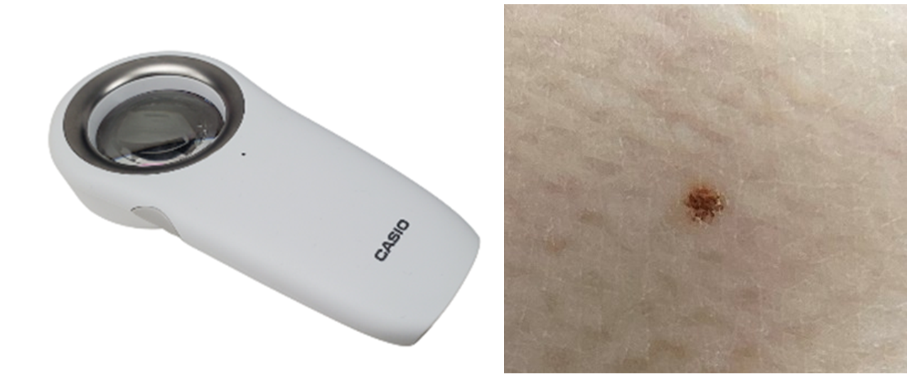 特殊な医療用拡大鏡で、肉眼では見えない皮膚の内部構造を観察し、良性か悪性かを判断します。